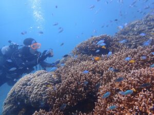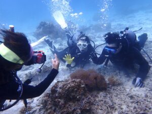 体験Kさんチームは、潜れるか心配していましたが海況穏やかな浅場エリアでニモ観察や