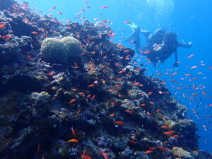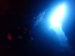2日目のFさんなので、ちょい深場の洞窟も挑戦。なかなか中性浮力が上手くなってきたよ^ – ^いいね